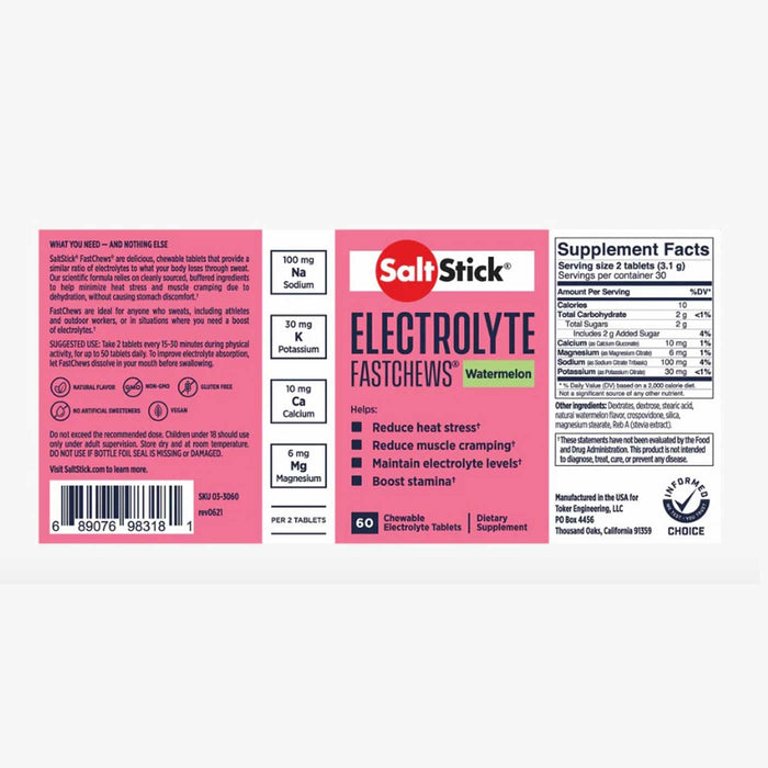 Informed Choice: SaltStick FastChews are regularly tested for banned substances under the Informed Choice program. Products undergo a rigorous, accredited four-step certification and testing process to provide athletes the highest level of assurance.