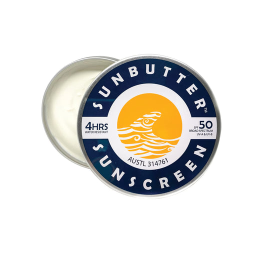 Sunbutter Skincarefrom $31.95| /SunButter Skincare Sunscreen SPF 50 Tin 100g Details SPF 50 Reef Safe Palm Oil Free Certified (POFCAP) No nano particles No Sunspheres (Nano Plast...