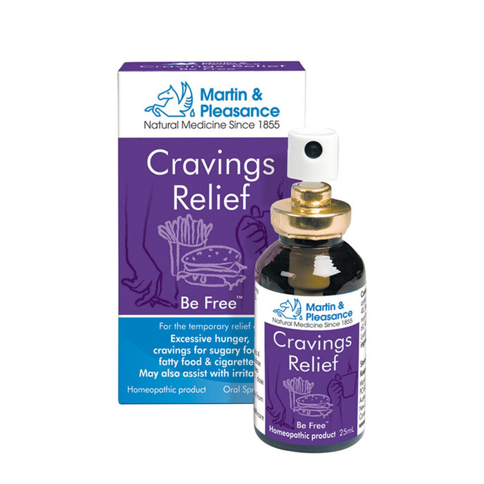Martin and Pleasance Cravings Relief Oral Spray is a homeopathic formulation combined with Schuessler Tissue Salts traditionally used for the relief of symptoms associated with excessive hunger ad cravings for sugary food, fatty food and cigarettes. Cravings Relief may also assist with the temporary relief of irritability.