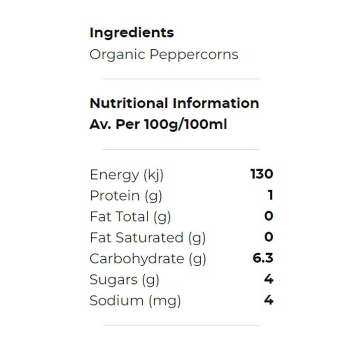 Organic Peppercorns - Black is one of the world's most used spices and is often referred to as the "king of spice." These whole peppercorns are actually berries obtained from the pepper plant. The berries are picked when they are half ripe and just about to turn red, then left to dry which causes them to shrivel and become dark in colour.