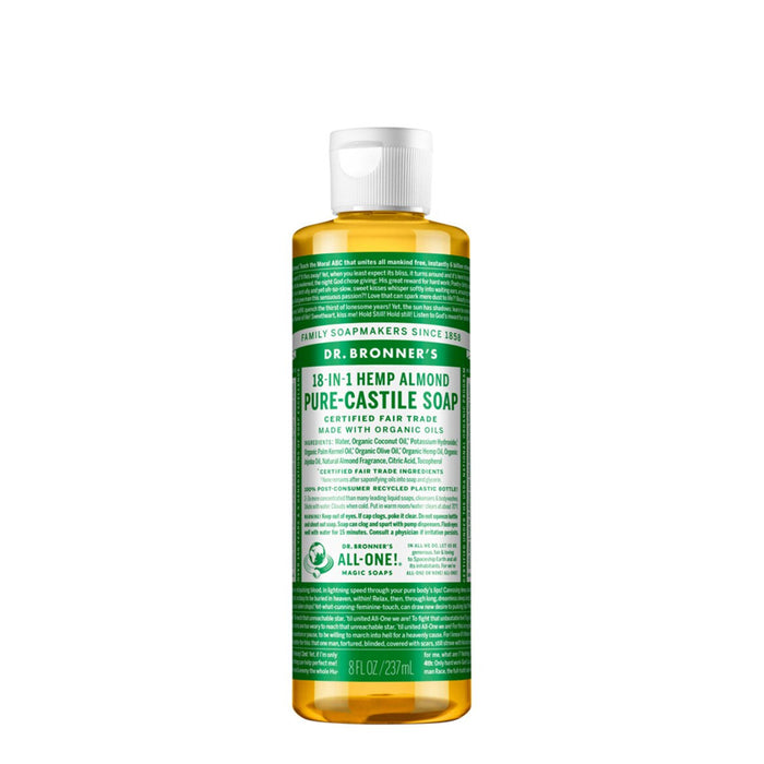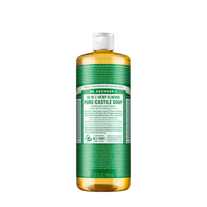 Warm, comforting and slightly sweet - like marzipan or amaretto! Our Almond Pure-Castile Liquid Soap is concentrated, biodegradable, versatile and effective. Made with organic and certified fair trade ingredients, packaged in a 100% post-consumer recycled bottle. All-One!
