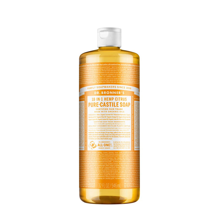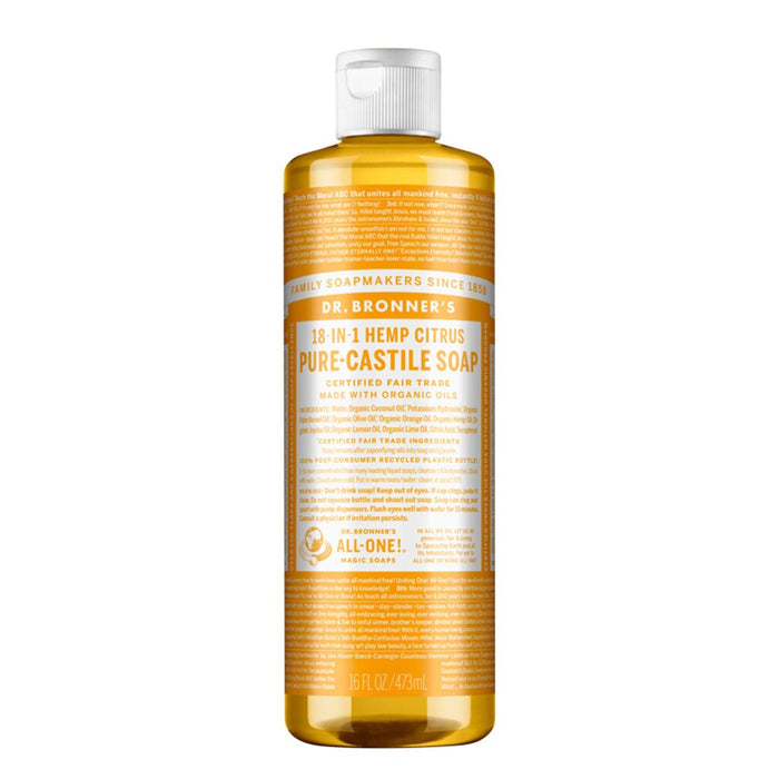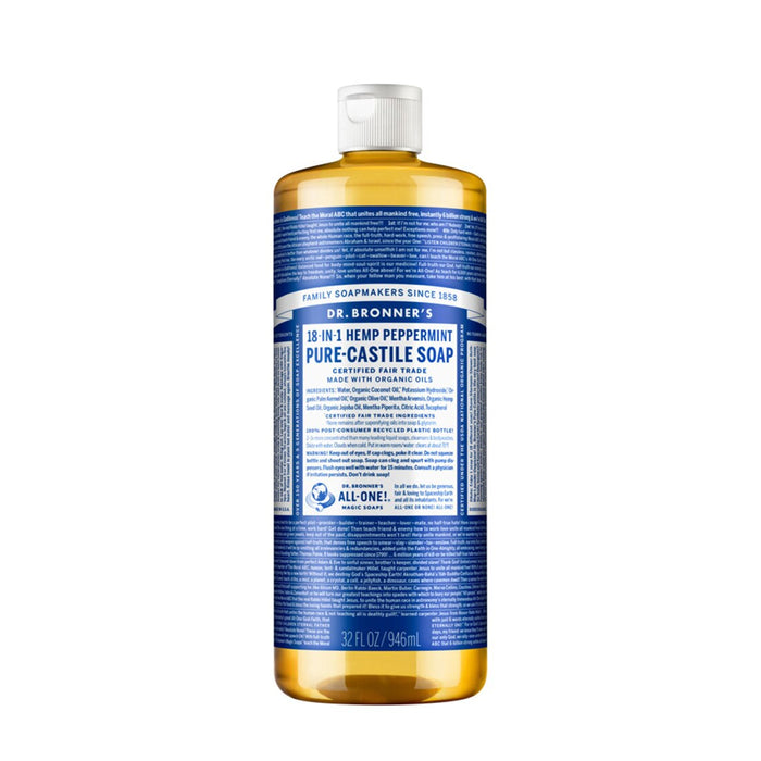 Dr. Bronner's 18-in-1 Pure-Castile Soaps are good for just about any cleaning task. Face, body, hair ‐ food, dishes, laundry, mopping, pets ‐ clean your house and body with no synthetic preservatives, detergents or foaming agents ‐ none!