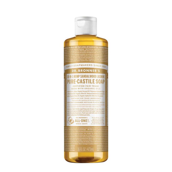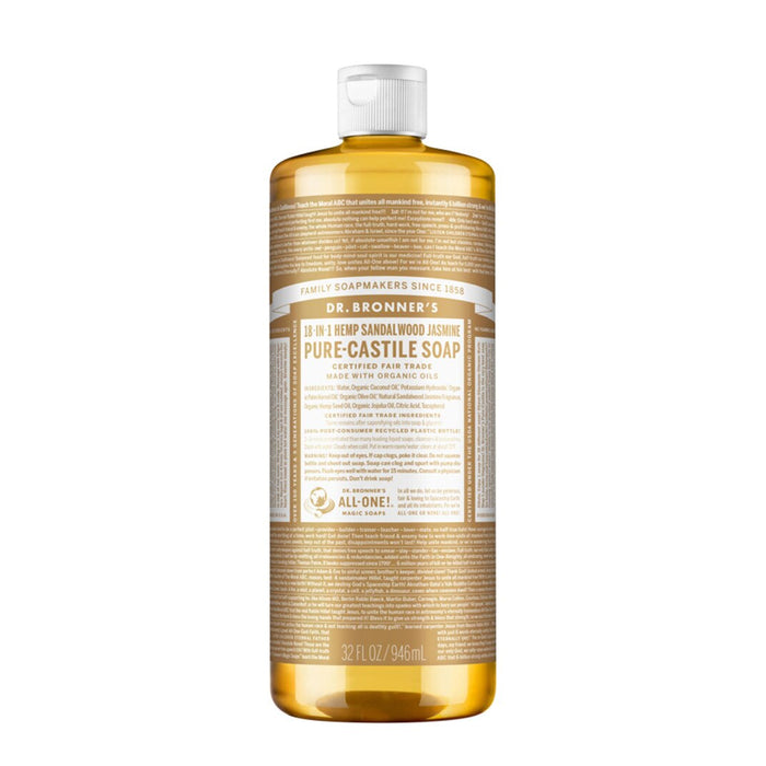 Warm and woody with fresh jasmine notes ‐ our Sandalwood Jasmine Pure-Castile Liquid Soap was first made for the wedding of Michael and Erin Bronner! Dr. Bronner's soap is concentrated, biodegradable, versatile and effective. Made with organic and certified fair trade ingredients, packaged in a 100% post-consumer recycled bottle. All-One!