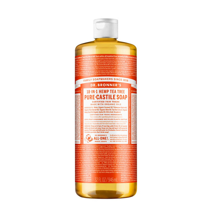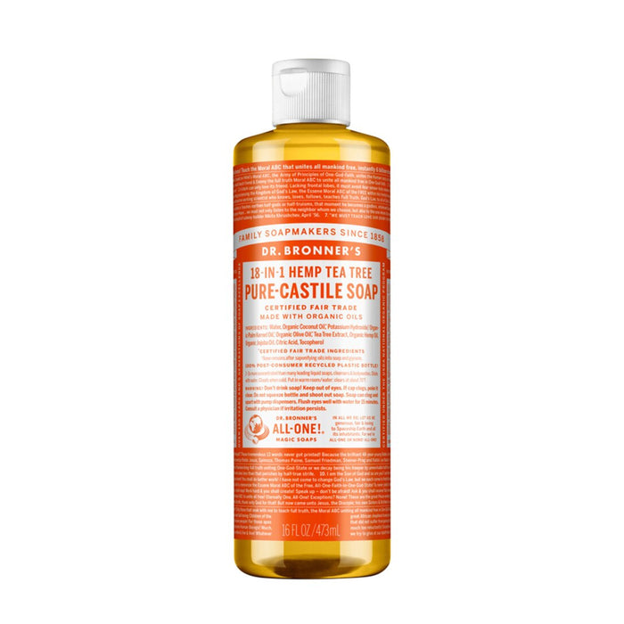 Woodsy and medicinal ‐ our Tea Tree Pure-Castile Liquid Soap contains pure tea tree oil ‐ good for acne-prone skin and dandruff! Dr. Bronner's soap is concentrated, biodegradable, versatile and effective. Made with organic and certified fair trade ingredients, packaged in a 100% post-consumer recycled bottle. All-One!