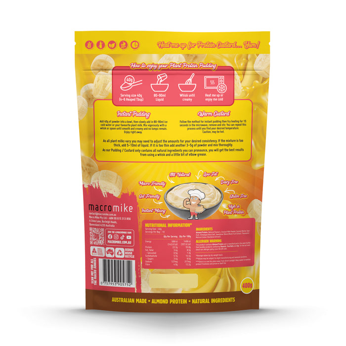 Banana Custard: Almond Protein, Faba Bean Protein, Natural Flavours, CoconutMilk Powder, Coconut Nectar, Guar Gum, Himalayan Rock Salt, Monk Fruit Extract, Natural Colour (Gardenia Extract).