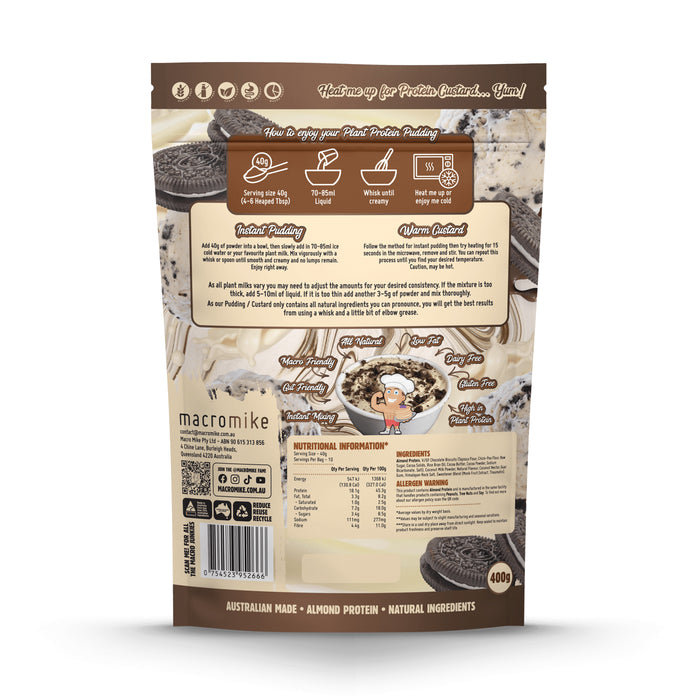 Cookies & Cream: Almond Protein, V/GF Chocolate Biscuits (Tapicoa Flour, Chick-Pea Flour, Raw Sugar, Cocoa Solids, Rice Bran Oil, Cocoa Butter, Cocoa Powder, Sodium Bicarbonate, Salt), CoconutMilk Powder, Natural Flavour, Coconut Nectar, Guar Gum, Himalayan Rock Salt, Monk Fruit Extract.